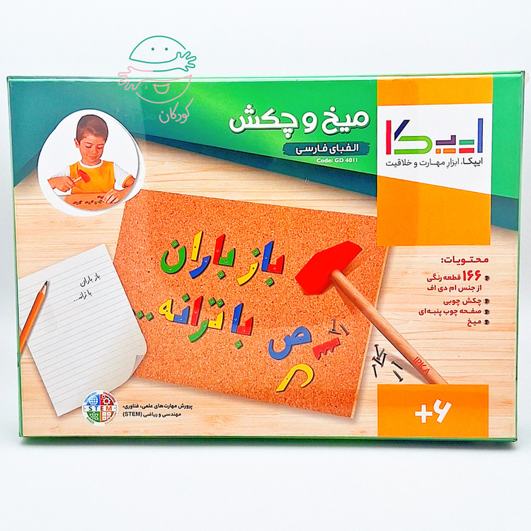 بازی میخ و چکش الفبای فارسی ایپکا با هدف تسهیل آموزش الفبا به کودکان طراحی و تولید شده است. استفاده از میخ و چکش برای کوبیدن حروف رنگارنگ فارسی بر روی صفحه ی چوب پنبه ای مهارت دست ورزی را در کودک تقویت می کند و در کنار بازی، تمرین دیکته را برای او به تجربه ای شیرین تبدیل می نماید.