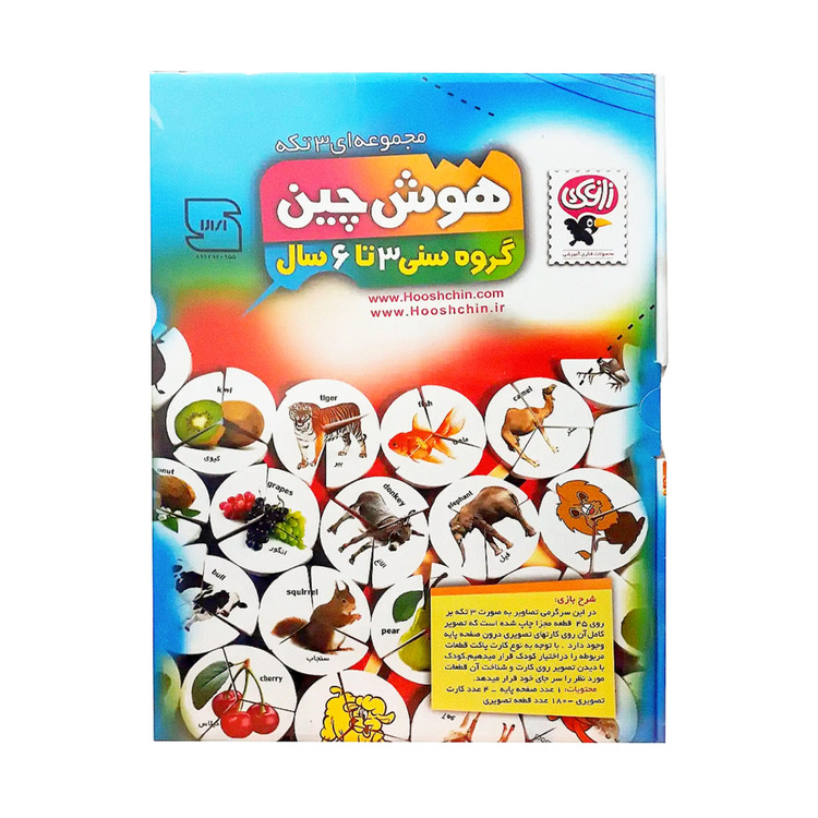 با این هوش چین کوچولو ها می تونن 180 تصویر از حیوانات و میوه ها را درست کنند، این هوش چین سه تکه می باشد یعنی هر تصویر با 3 قطعه پازل کامل می شود و برای آموزش رنگ ها، میوه ها و حیوانات به زبان انگلیسی و فارسی به کوچولو ها ایده آل است.