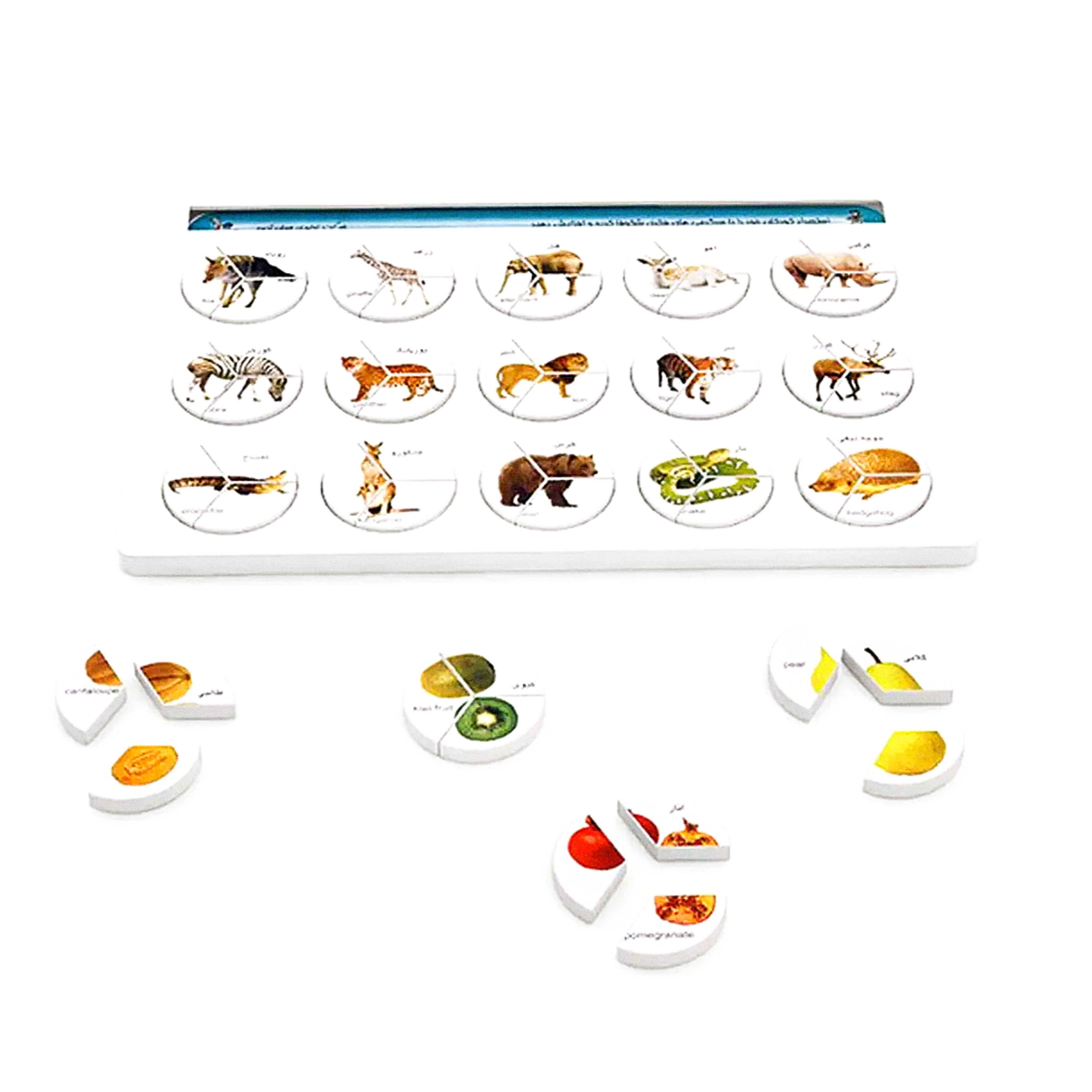 در این سرگرمی تصاویر به صورت 3 تکه بر روی 45 قطعه مجزا چاپ شده است که تصویر کامل آن روی کارت های تصویری درون صفحه پایه وجود دارد. با توجه به نوع کارت پاکت قطعات مربوطه را در اختیار کودک قرار می دهیم. کودک با دیدن تصویر روی کارت و شناخت آن قطعات مورد نظر را سر جای خود قرار می دهد.